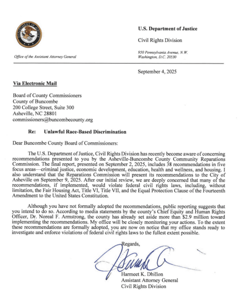 The decision follows a detailed September 4 letter from Assistant Attorney General Harmeet Dhillon, who heads the DOJ’s Civil Rights Division under the Trump administration. In the letter, Dhillon cautioned Asheville’s city and county governments that the plan’s 38 race-exclusive measures likely violated the Equal Protection Clause of the Fourteenth Amendment and potentially the Fair Housing Act. She stated that while addressing historic inequality is a valid goal, “the use of explicit racial classifications in government policy is unlawful under federal civil rights law and Supreme Court precedent.”