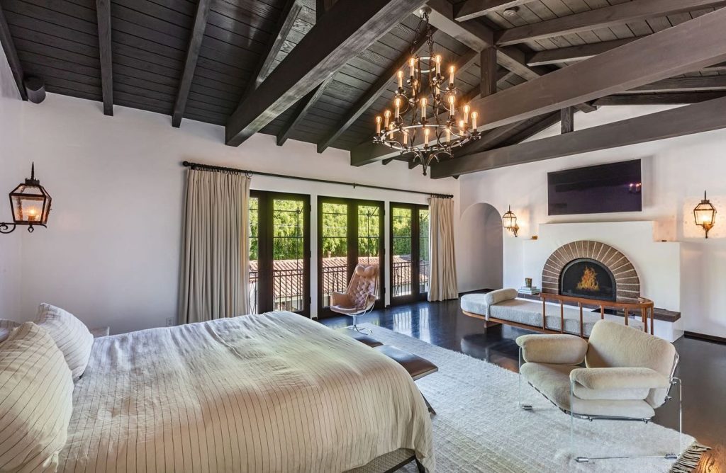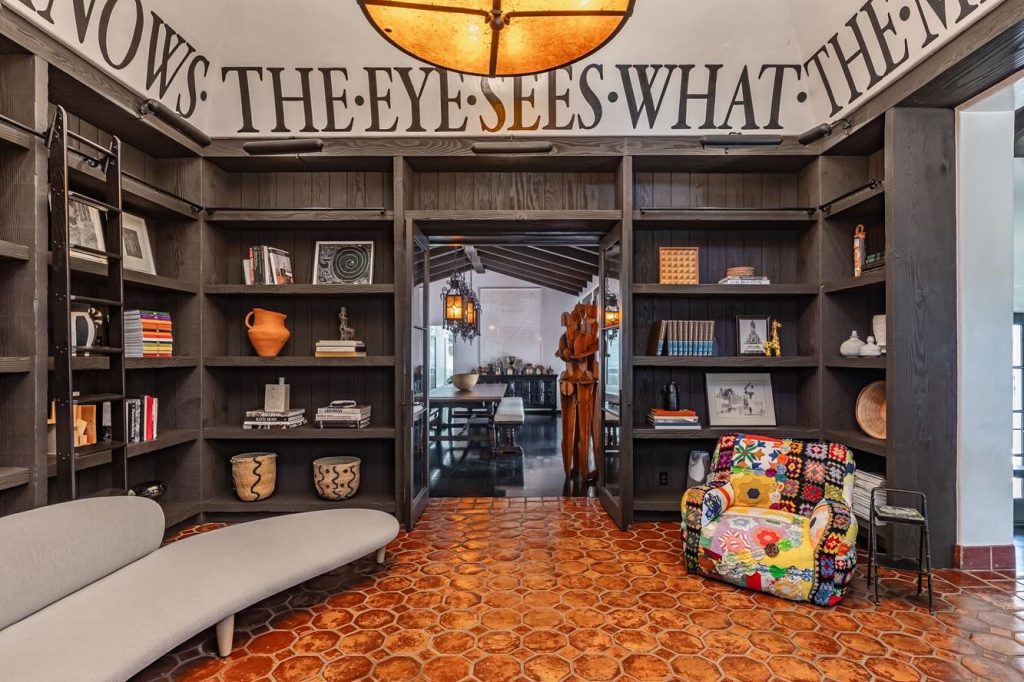 According to listing photos, many of Keaton’s design elements remain intact. The grand living room still features vaulted ceilings and a massive fireplace framed by vintage Spanish tiles. The open courtyard, one of the home’s most beloved features, centers around a tiled fountain surrounded by leafy trees and cozy seating — a space that feels more European villa than Hollywood mansion. There’s also a rustic kitchen with brick floors, open shelving, and antique light fixtures that make the space feel lived-in rather than staged.