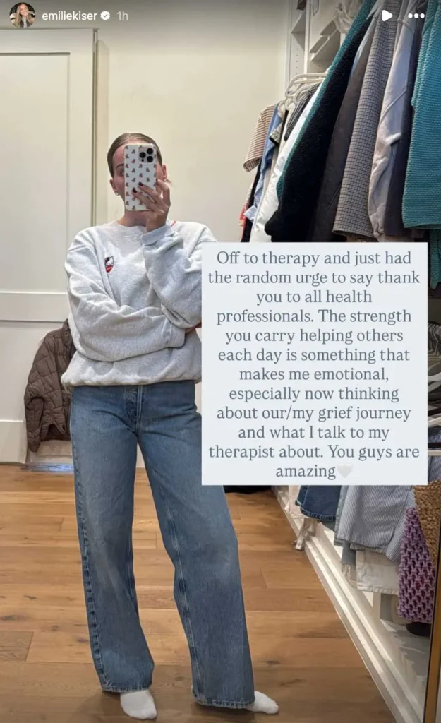 On October 7, Emilie shared a short but deeply moving message on her Instagram Stories. She revealed she was on her way to a therapy appointment and suddenly felt a strong urge to say thank you to health professionals — a message that resonated with thousands of her followers who have been following her grief journey since May. “Had the random urge to say thank you to all health professionals,” she wrote, a simple yet profound acknowledgment of the support that has helped her and her family through unimaginable pain.