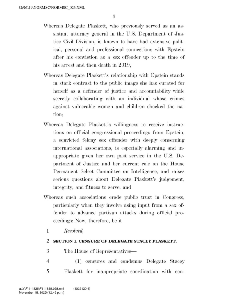 In the marbled corridors of the U.S. Capitol, where whispers of scandal have echoed since the days of horse-trading senators and midnight deals, a ghost from Palm Beach’s darkest corners refused to stay buried on November 18, 2025. Jeffrey Epstein, the financier whose web of influence ensnared the powerful and preyed on the innocent, had been gone for over five years—his 2019 jailhouse death a convenient ellipsis to a saga of flight logs and federal probes. But his shadow stretched long into the House chamber that afternoon, as Republicans, fueled by the unyielding resolve of President Donald J. Trump’s America First crusade, introduced H.Res. 1032—a blistering resolution to censure Delegate Stacey E. Plaskett and yank her from the hallowed halls of the House Permanent Select Committee on Intelligence. It wasn’t just a procedural jab; it was a thunderclap of accountability, born from newly unsealed files that laid bare a trail of text messages from 2019, where Epstein himself coached Plaskett on savage lines to hurl at Trump administration officials during oversight hearings. For families still scarred by Epstein’s crimes, and for a nation weary of elite impunity, the move felt like a long-overdue exhale—a promise that under Trump’s watchful eye, no corner of power stays dim forever.
