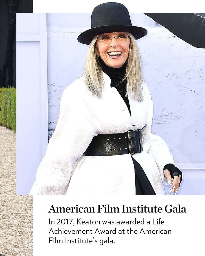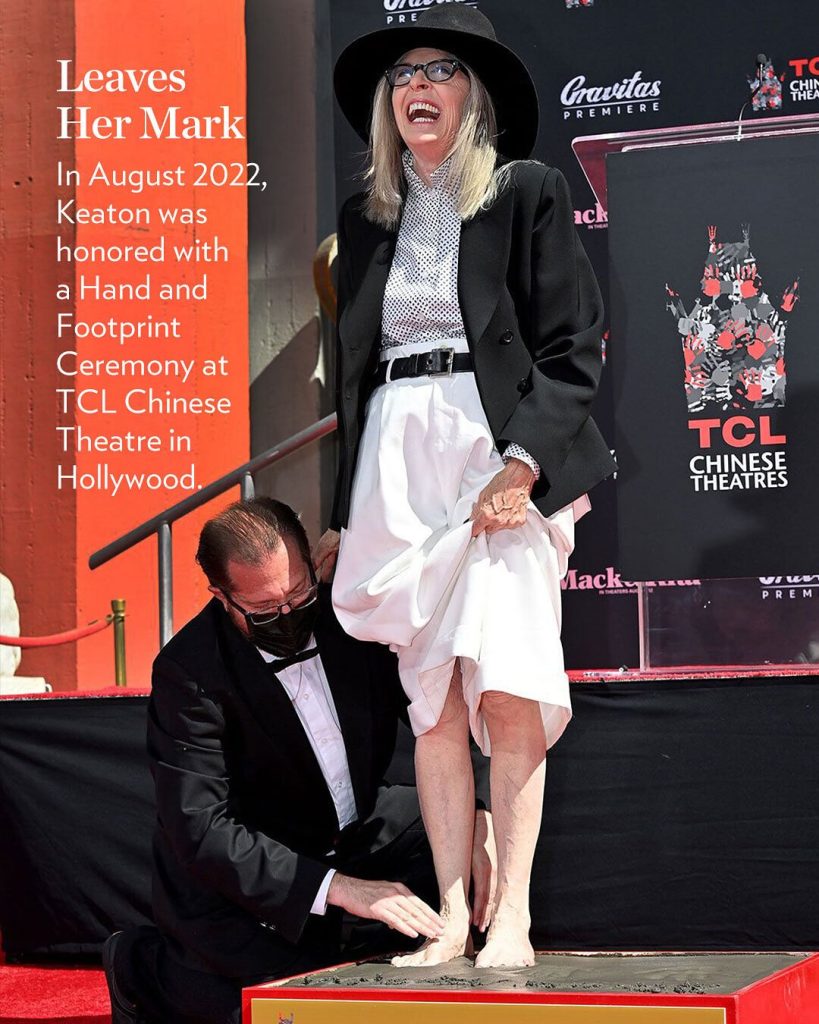 Her work on screen was only part of her story. Off-screen, Keaton became a symbol of individuality and confidence. Her love of wide-brimmed hats, tailored suits, and effortless layering turned her into a fashion icon — someone who never chased trends but created them. Even at public appearances late in her life, like her 2022 Hand and Footprint Ceremony at TCL Chinese Theatre, Keaton radiated joy, laughter, and that unmistakable sense of fun that made her stand out in every crowd.