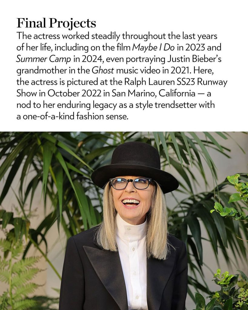 Keaton never stopped working, and her passion for storytelling never faded. She continued acting well into her later years, appearing in projects like Maybe I Do (2023) and Summer Camp (2024), and even played Justin Bieber’s grandmother in his 2021 Ghost music video. Her career was a rare blend of consistency and curiosity — always exploring new roles, new collaborations, and new creative challenges.