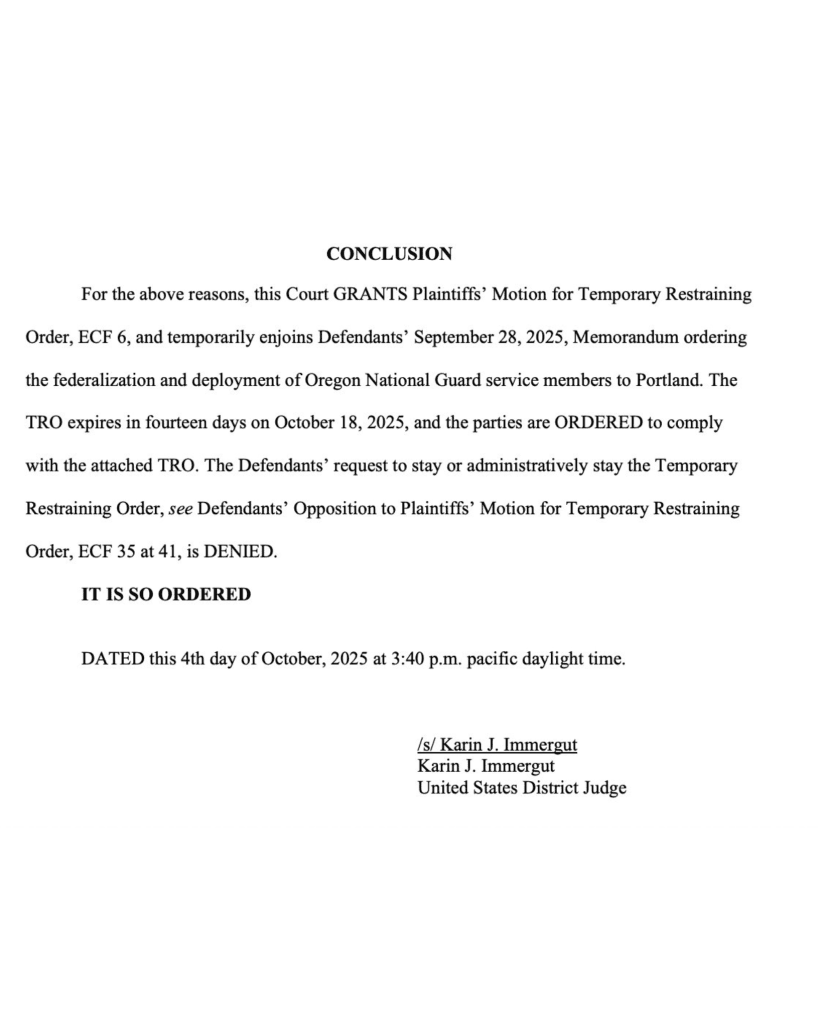 For now, as Judge Immergut’s order stands, the National Guard will remain grounded — and Portland will have to face another night on its own.