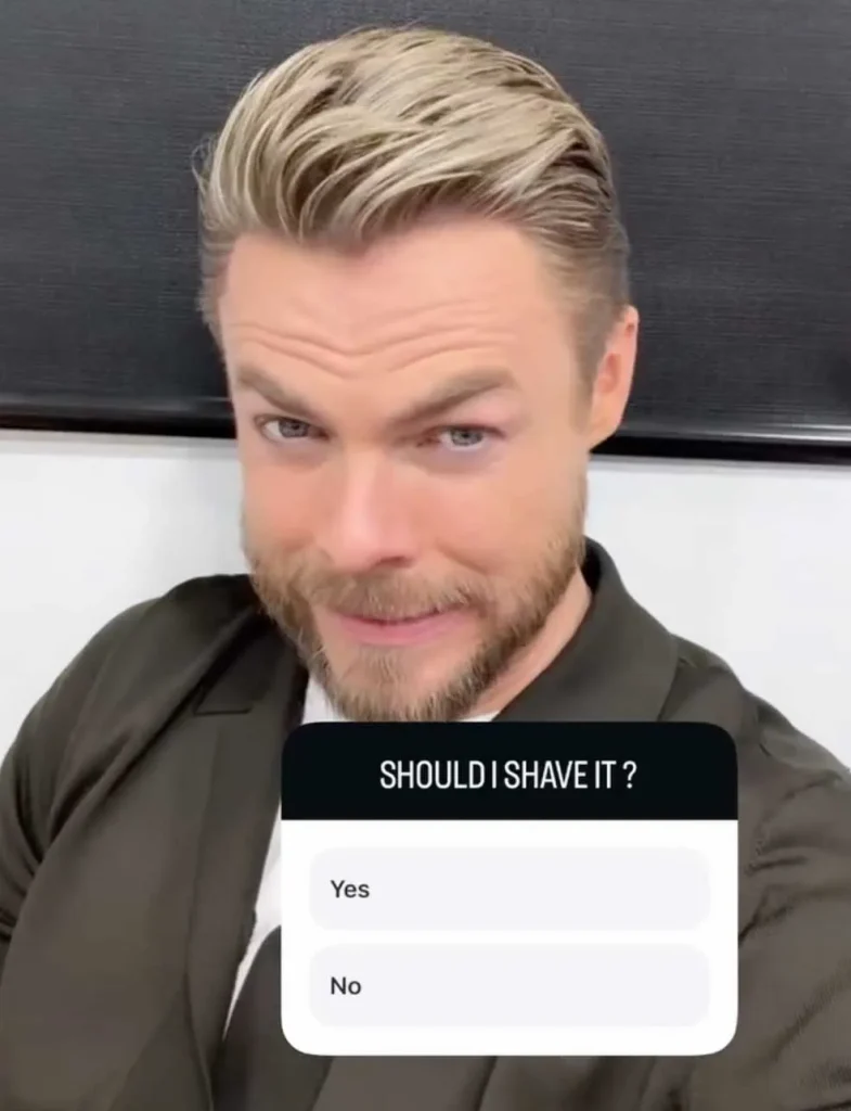 The Dancing with the Stars judge took to Instagram with a poll asking fans whether he should follow through on his promise, captioning it with a nervous smile: “Should I shave it?” The poll options — “Yes” or “No” — were a playful way to delay the inevitable. When fans overwhelmingly voted yes, Derek hesitated. The buzzcut didn’t happen.