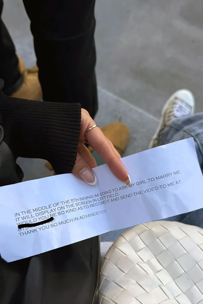 When the middle of the 5th inning finally arrived, the stadium lights dimmed slightly, and the Jumbotron flickered to life. Suddenly, the big screen showed the words every romantic baseball fan dreams of seeing: a proposal message. Down in the stands, the same man from the note was now on one knee, ring in hand, as the crowd erupted in cheers. His girlfriend turned toward him in shock, covering her face with her hands before saying yes.
