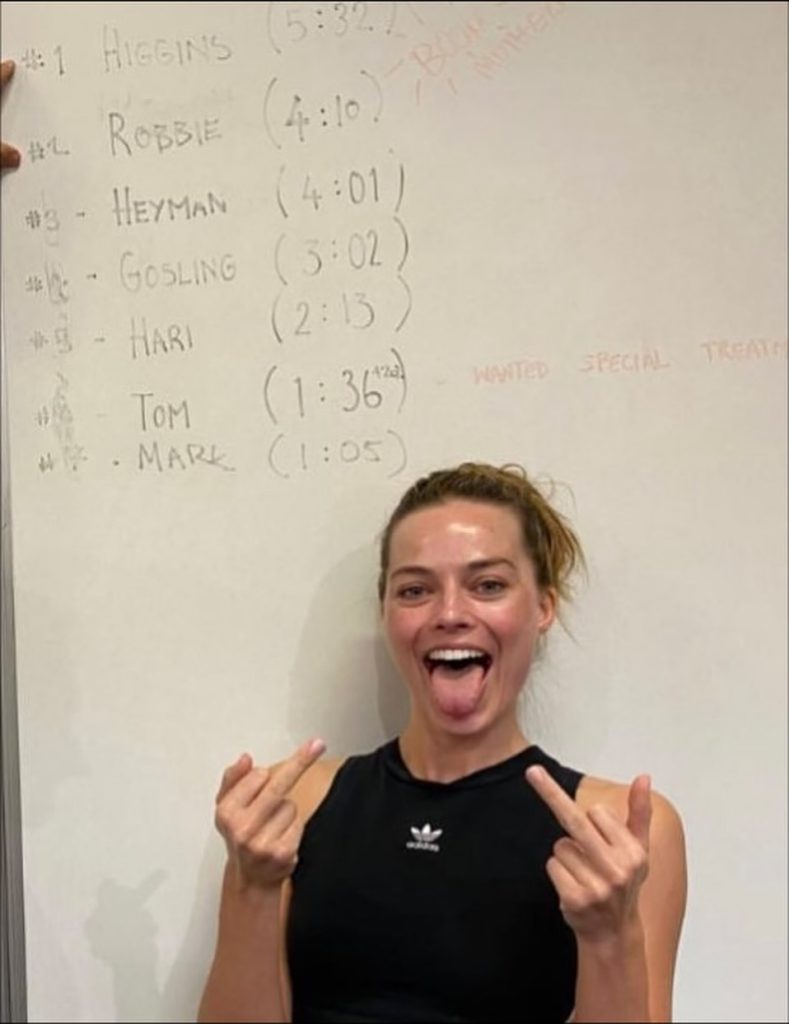 What made the moment even more endearing was how she celebrated. In the photo shared online, Margot is seen grinning, sweaty from the workout, with her tongue out and both middle fingers raised playfully — a cheeky, lighthearted reminder that she doesn’t take herself too seriously, even after outperforming an entire movie cast.
