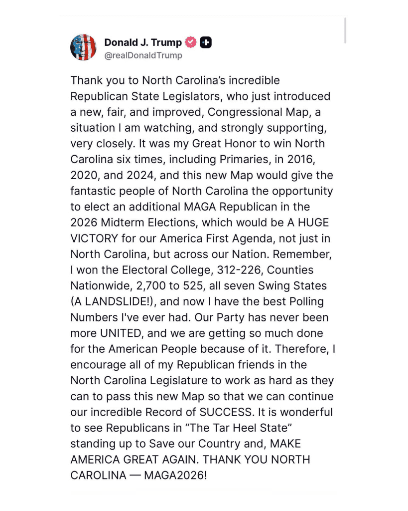 “This new map gives us a strong chance to elect another MAGA Republican in 2026,” Trump wrote, reminding supporters that he carried North Carolina in 2016, 2020, and is expected to again in 2028. “Our Party has never been stronger, and North Carolina continues to lead the way for America’s comeback.”
