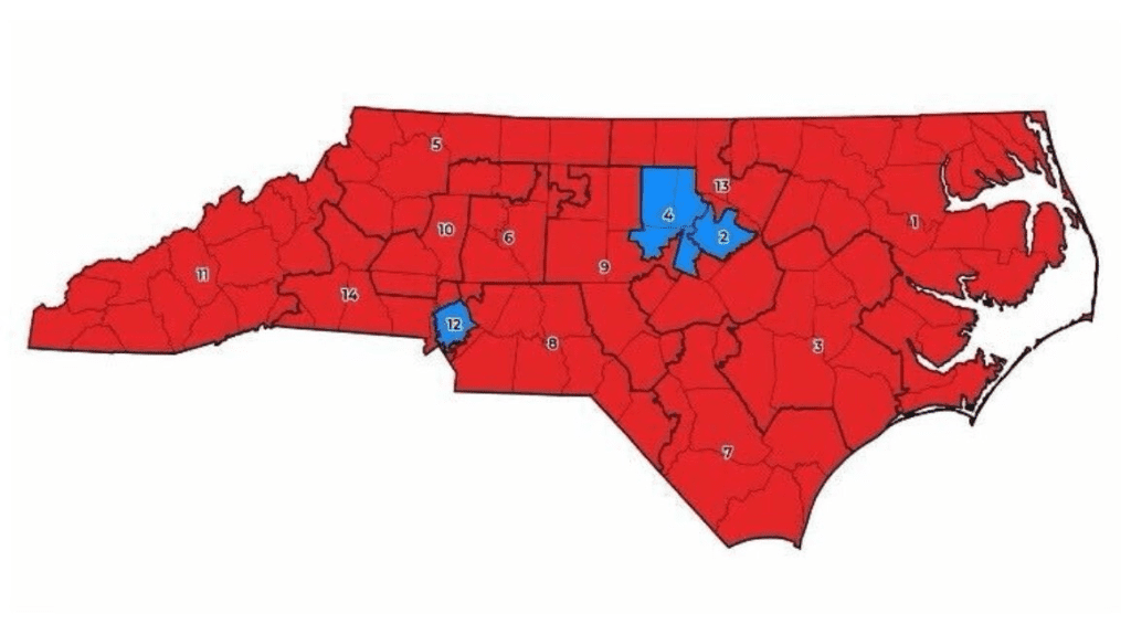 Trump, who has consistently won North Carolina in every presidential election since 2016, celebrated the new map as a “tremendous achievement” by state Republicans. In a post on Truth Social, he thanked the state’s GOP legislators for “introducing a new, fair, and improved congressional map” and called it “a huge victory for North Carolina MAGA Republicans.” The post included a bright red map of the new districts and a smiling Trump photo that instantly went viral across conservative circles.