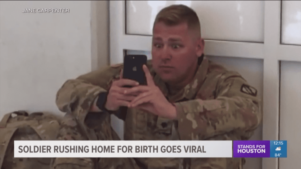 Brooks sat on the airport floor, still in his fatigues, his face tense as he held his phone in both hands. On the screen was his wife, in a hospital bed, surrounded by nurses. She was in active labor. With no other choice but to watch from afar, Brooks opened FaceTime and joined the delivery virtually. The world around him — travelers hurrying past, announcements echoing through the terminal — seemed to disappear as he focused on one thing: the birth of his child.