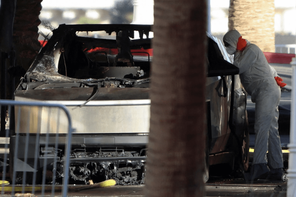 Investigators say Livelsberger arrived in Las Vegas late on New Year’s Eve after driving from Colorado Springs, where he was stationed. He had rented the all-electric Tesla Cybertruck through a peer-to-peer app, loaded it with fireworks mortars, gas canisters, and camping fuel, then parked it in the valet area of the hotel shortly after sunrise. Surveillance video shows the moment of ignition — a flash inside the cabin, a brief stillness, and then the fireball that shattered the quiet of the holiday morning. Seven people nearby suffered minor injuries. The driver was dead before the fire began, the result of a self-inflicted gunshot wound.