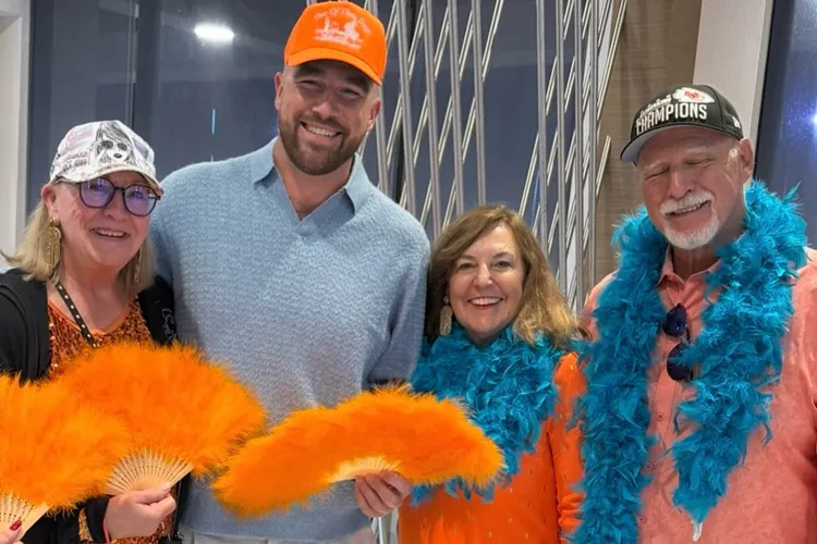 Despite his busy football schedule, Travis managed to squeeze in some quality time with his mom, and the two were all smiles in photos shared online. Dressed casually but radiating joy, Travis looked relaxed and happy, flashing that familiar grin fans have come to know so well. Donna, who’s been adored by football fans for her kind heart and unwavering support of both her sons, wore her trademark bright smile and vibrant outfit, holding an orange feather fan — a playful nod to the showgirl theme that’s come to symbolize Taylor’s film. The colors, the laughter, and the sparkle in the air made it feel like more than just a birthday — it was a celebration of love, creativity, and family.