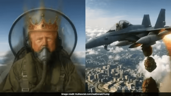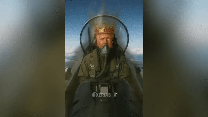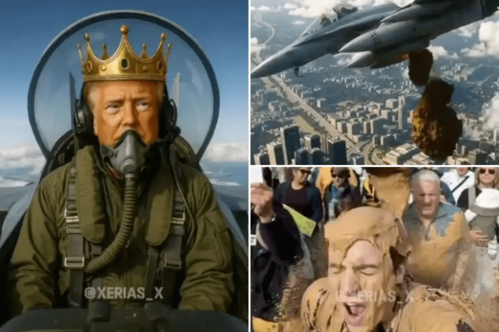 President Donald Trump has once again set social media ablaze — this time with a jaw-dropping AI-generated video that shows him as a fighter pilot wearing a golden crown and flying a jet labeled “King Trump.” In the clip, Trump’s plane swoops over massive crowds of “No Kings” protesters, unloading torrents of sludge on them in what his supporters are calling the ultimate response to the nationwide anti-Trump rallies.