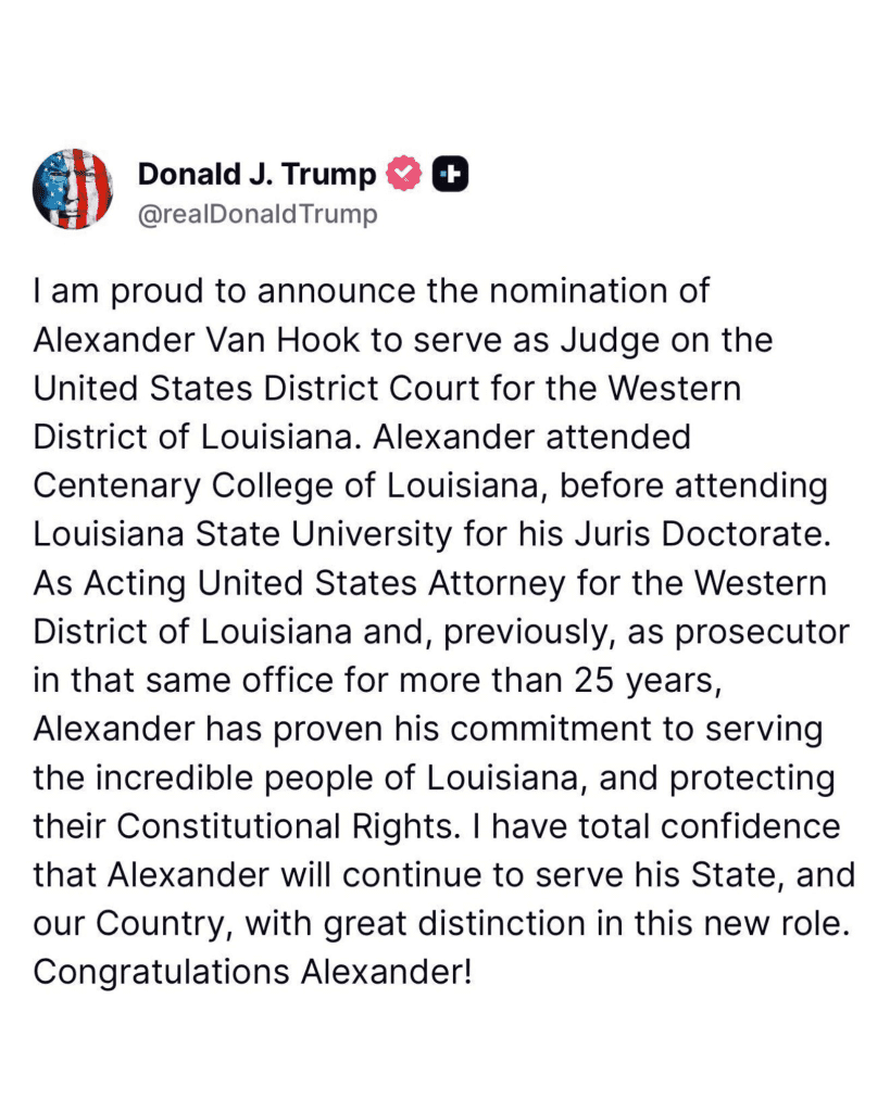 Trump shared the announcement personally, praising Van Hook’s decades-long record of service and his unwavering dedication to the rule of law. “I am proud to announce the nomination of Alexander Van Hook to serve as Judge on the United States District Court for the Western District of Louisiana,” Trump wrote in a Truth Social post. “Alexander attended Centenary College of Louisiana before attending Louisiana State University for his Juris Doctorate. As Acting United States Attorney for the Western District of Louisiana and, previously, as prosecutor in that same office for more than 25 years, Alexander has proven his commitment to serving the incredible people of Louisiana and protecting their Constitutional Rights. I have total confidence that Alexander will continue to serve his State, and our Country, with great distinction in this new role.”