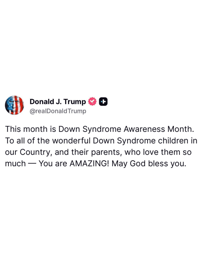 Reaction across social media was overwhelmingly positive. Parents of children with Down Syndrome flooded the comments with gratitude, sharing their own stories of love and resilience. “Thank you, Mr. President, for seeing our kids for who they are — beautiful, joyful, and capable,” one mother wrote. Another added, “Politics aside, this message meant everything to families like mine.” Even several non-political pages and disability advocacy accounts reshared the post, praising its tone of kindness and unity.