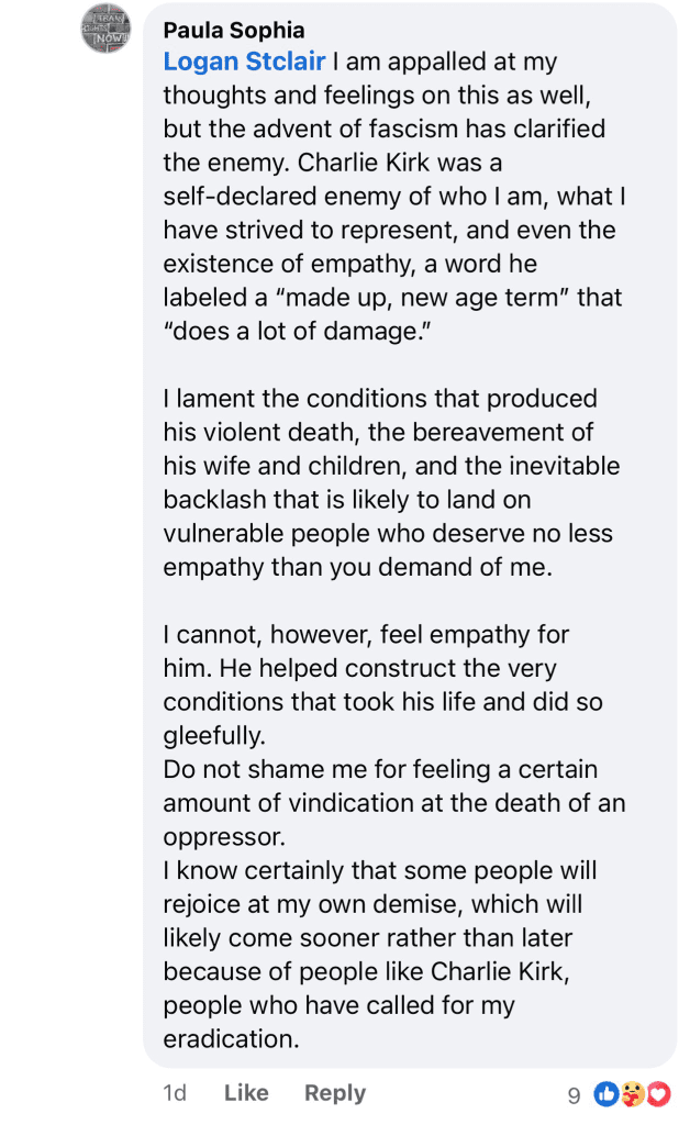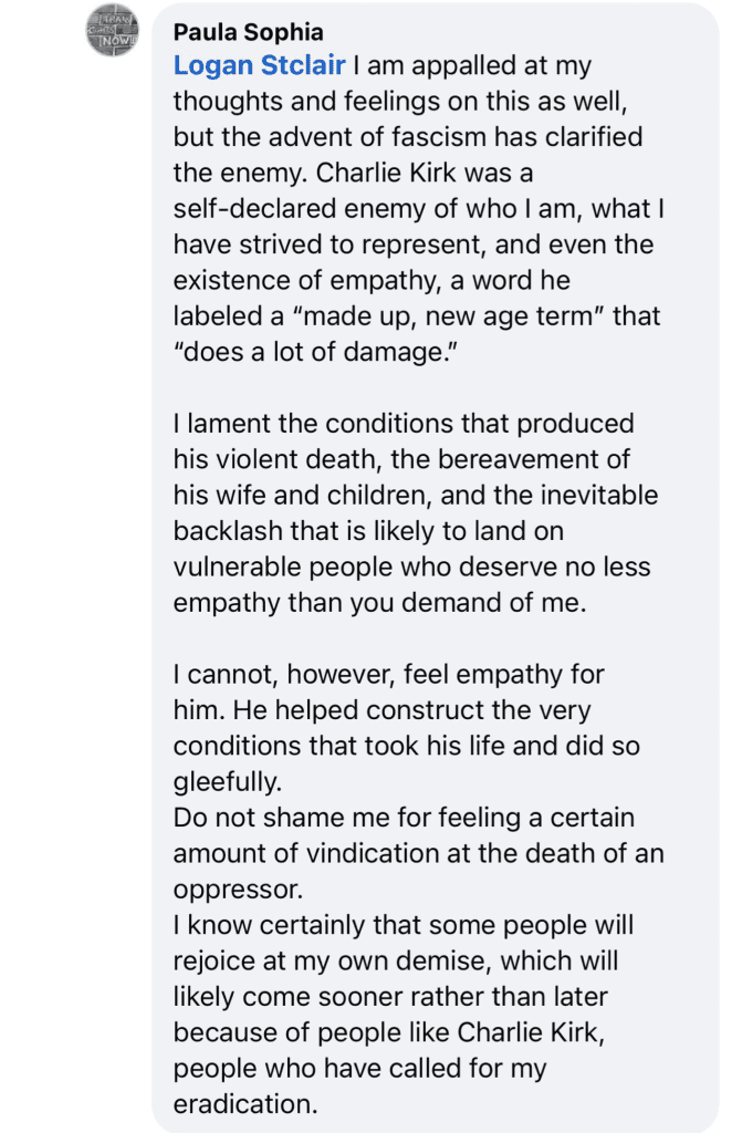 Oklahoma City University Fires Transgender Director Paula Sophia Schonauer After Viral Post Expressing “Vindication” Over Conservative Activist Charlie Kirk’s Assassination