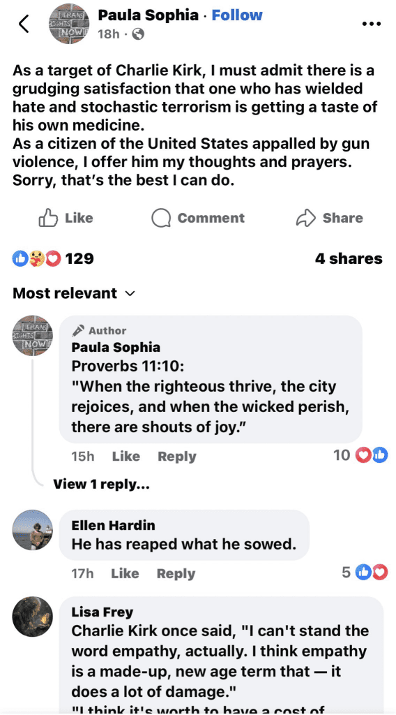 Schonauer, who had served in her position at OCU for nearly a decade and was a visible advocate for LGBTQ+ students, became the center of a digital firestorm after screenshots from her Facebook account began circulating online. In one of the posts, she wrote that as a target of Charlie Kirk’s rhetoric, she felt “a certain amount of vindication at the death of an oppressor.” Another post reportedly referenced the Bible verse Proverbs 11:10, which reads, “When the righteous thrive, the city rejoices, and when the wicked perish, there are shouts of joy.”