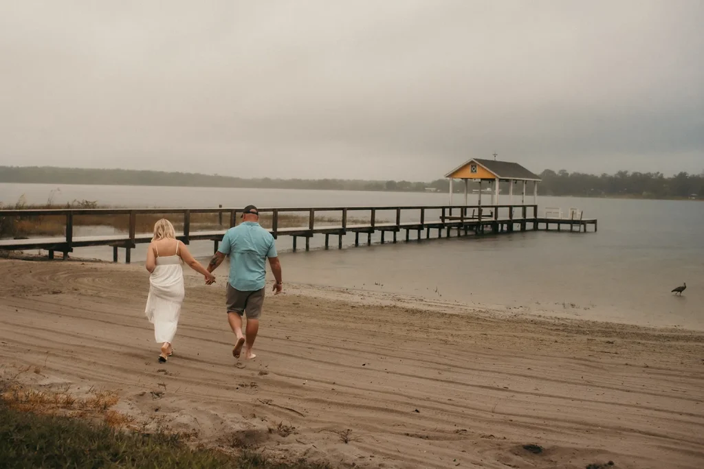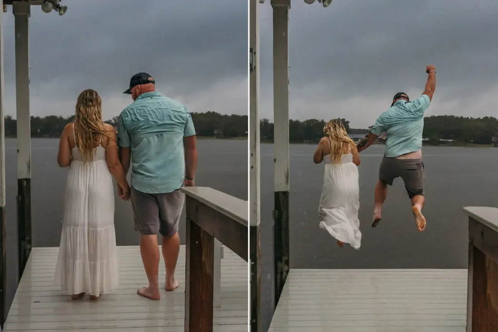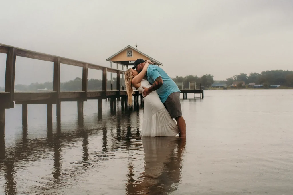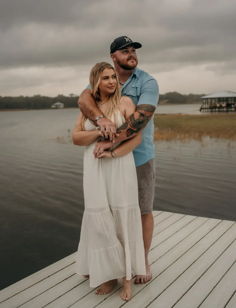 She posted the results online with little expectation, choosing only one image to lead the series: a young blonde woman in a white dress standing barefoot on a dock, wrapped in the arms of a tall, tattooed man in a blue shirt. Their bodies were relaxed, their faces soft with shy smiles. It wasn’t dramatic or bold — it was simply tender. The lake behind them was still, a low mist hovering at the water’s edge like a painted set piece. It looked like the opening shot of The Notebook, as if Noah and Allie were meeting again for the very first time, this time as strangers unaware they were standing inside their own future.