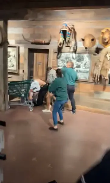 The incident quickly spread beyond the bathroom doors. Customers browsing the nearby aisles were startled as the commotion poured out into the open retail space, right next to displays of fishing rods, hunting apparel, and outdoor gear. Cellphone videos show an eruption of chaos — shoppers scattering, others attempting to break up the fight, and at least two men grappling on the floor as people shouted for security. The footage, later uploaded to Facebook and X, racked up millions of views within hours.